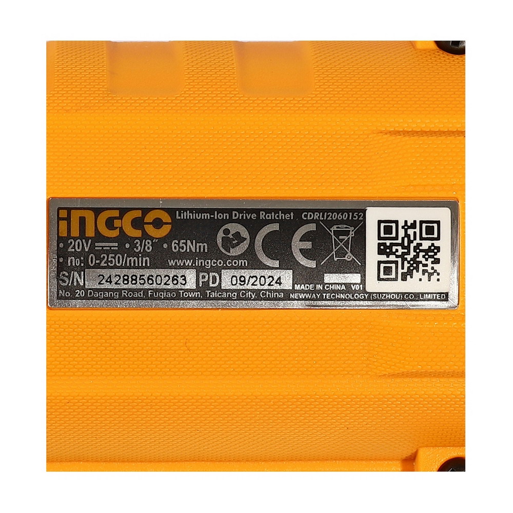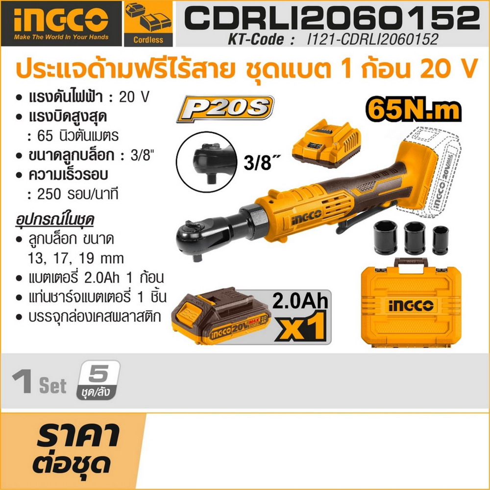 INGCO ประแจด้ามฟรี ไร้สาย 20V รุ่น CDRLI2060152 แรงบิดสูงสุด 65 NM ความเร็วรอบ 250 RPM รวมแบตเตอรี่และแท่นชาร์จ