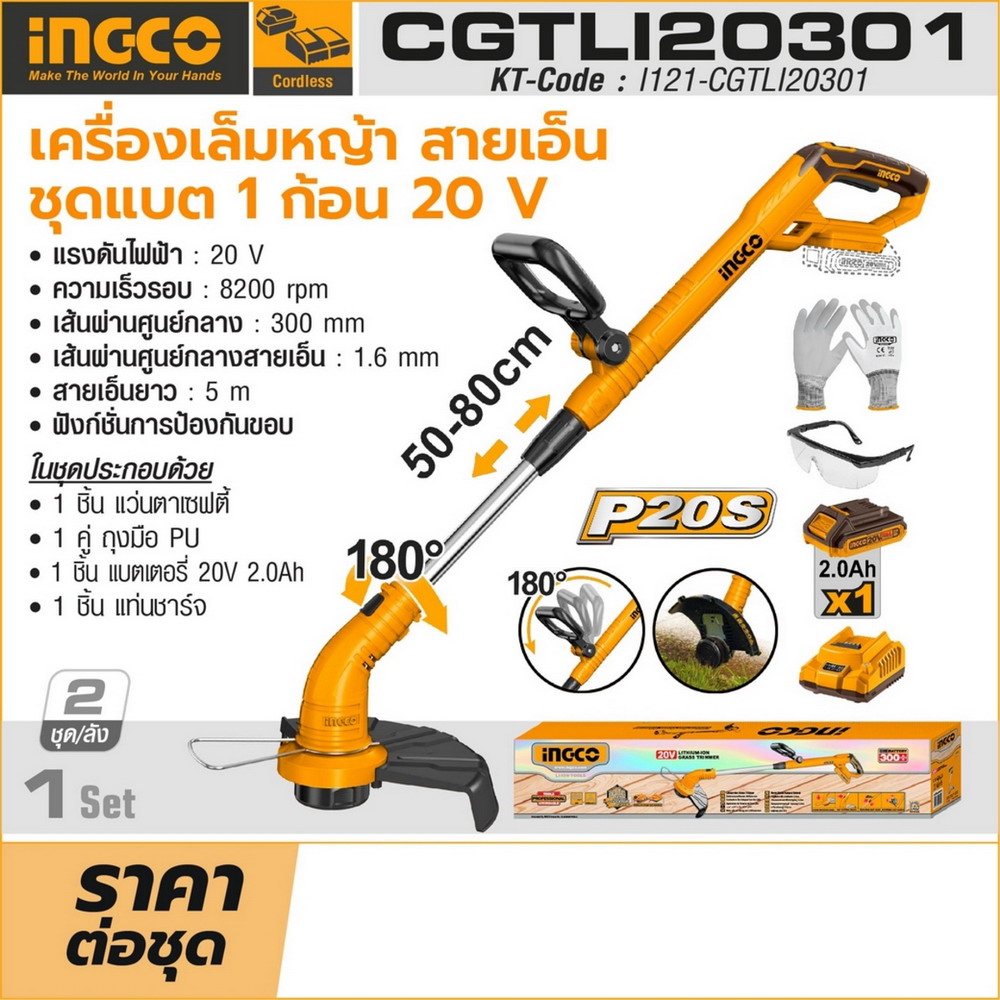 • เครื่องเล็มหญ้าไร้สาย INGCO รุ่น CGTLI20301 แรงดันไฟฟ้า : 20 โวลต์