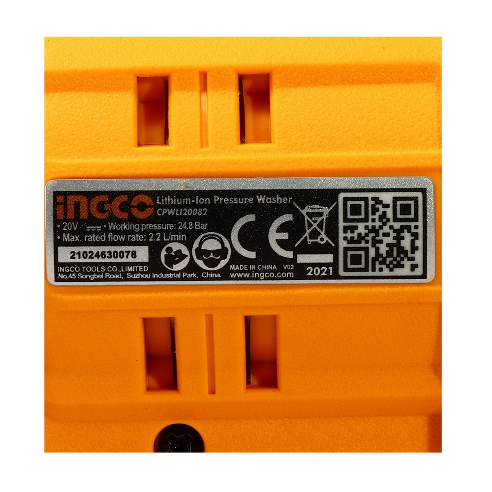 INGCO ปืนฉีดน้ำแรงดันสูงไร้สาย 20 โวลต์ รุ่น CPWLI20082 แรงดันสูงสุด 24.8 บาร์ อัตราการไหล 2.2 ลิตร/นาที มีระบบหยุดอัตโนมัติ