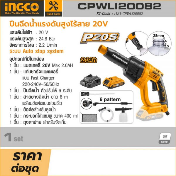 • ปืนฉีดน้ำแรงดันสูงไร้สาย 20 โวลต์ INGCO รุ่น CPWLI20082
