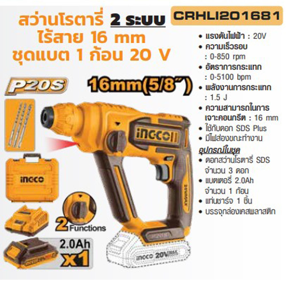 INGCO สว่านโรตารี่ไร้สาย 20 โวลต์ 16 มม. รุ่น CRHLI201681 ความเร็วรอบ 0-850 รอบ/นาที รวมแบตเตอรี่และแท่นชาร์จ