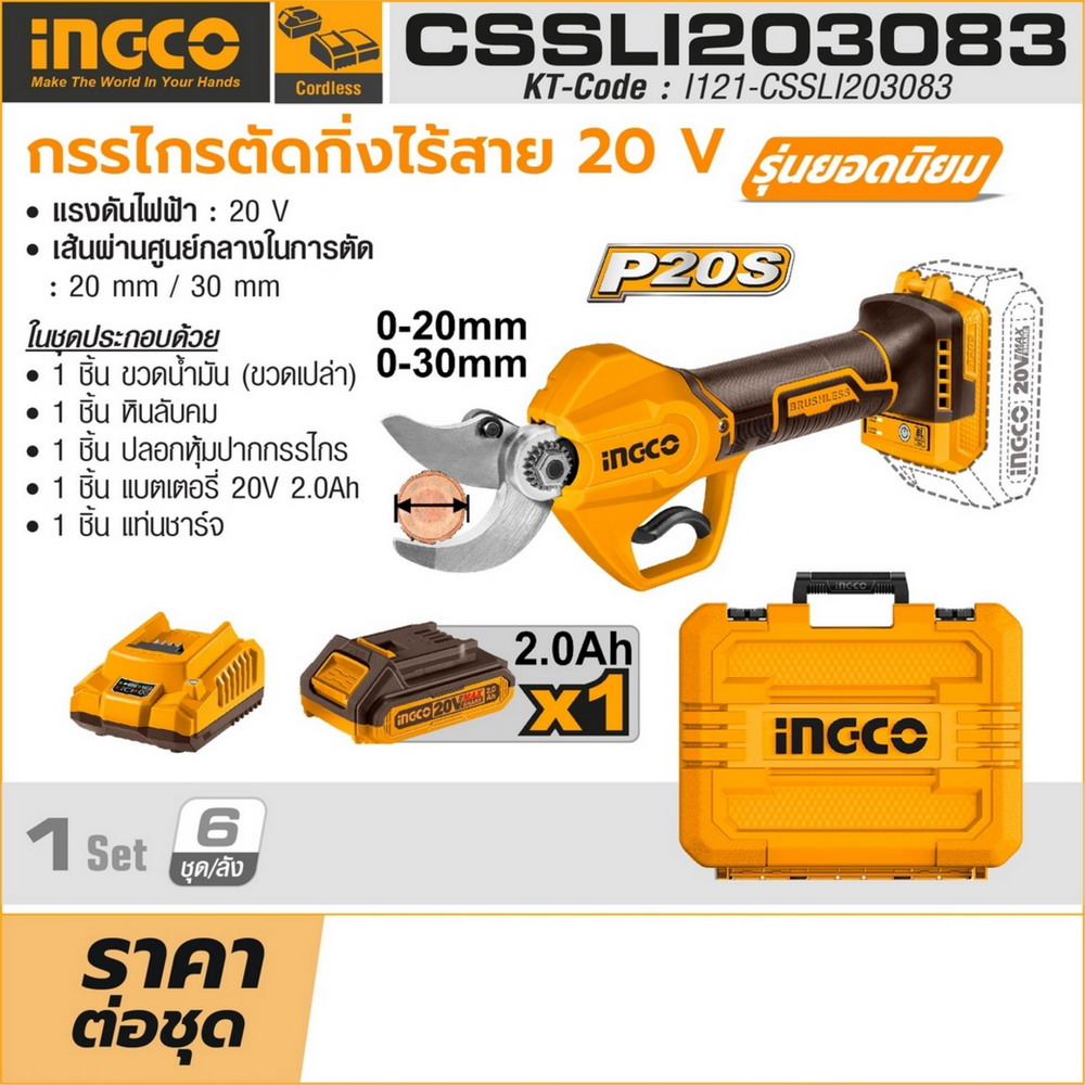 INGCO CSSLI203083 กรรไกรตัดกิ่งไร้สาย 20V. มอเตอร์ Brushless สามารถตัดได้ 20-30MM. พร้อมแท่นชาร์จ