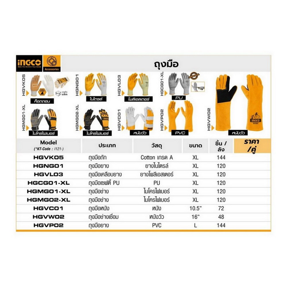 INGCO HGVC01 ถุงมือหนัง ถุงมือเซฟตี้ 10.5 นิ้ว ยางหุ้มข้อมือ
