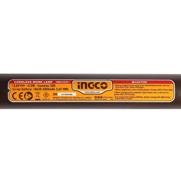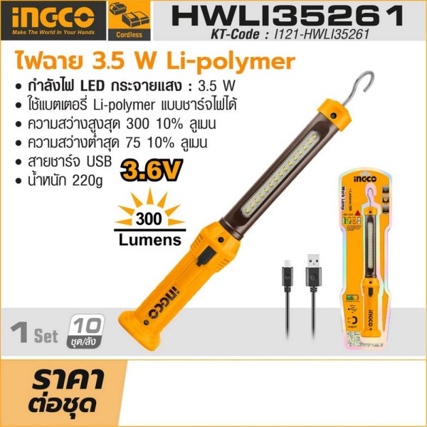 INGCO HWLI35261 ไฟฉายพกพา Li-polymer ชาร์จไฟได้ 3.5W. ความสว่างสูงสุด 300 ±10% ลูเมน