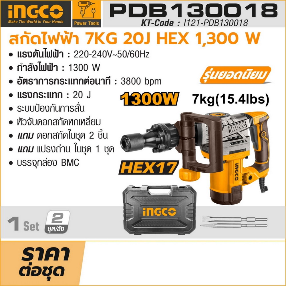 INGCO PDB130018 สกัดไฟฟ้า 220V.1300W. แรงกระแทก 20 จูล อัตราการกระแทก 3,800 BPM