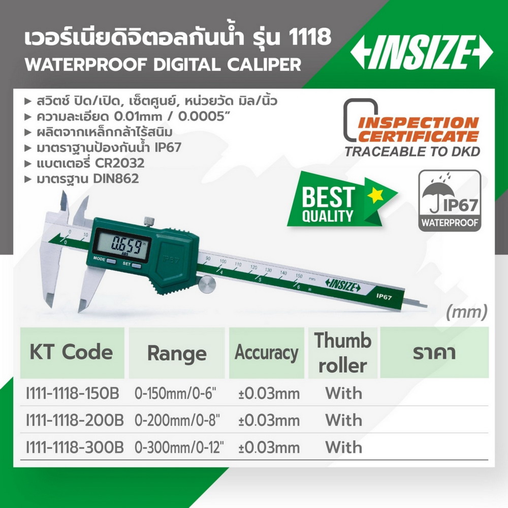 • เวอร์เนียร์ดิจิตอลกันน้ำ (Waterproof Digital Caliper) INSIZE (อินไซส์) รุ่น 1118-200B