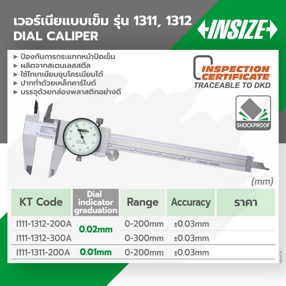 INSIZE เวอร์เนียร์ไดอัลแบบเข็ม (Dial Caliper) รุ่น 1312-300A ช่วงระยะวัด 0-300 มม. G0.02 ความละเอียด 0.02 มม. ความแม่นยำ ±0.04 มม.