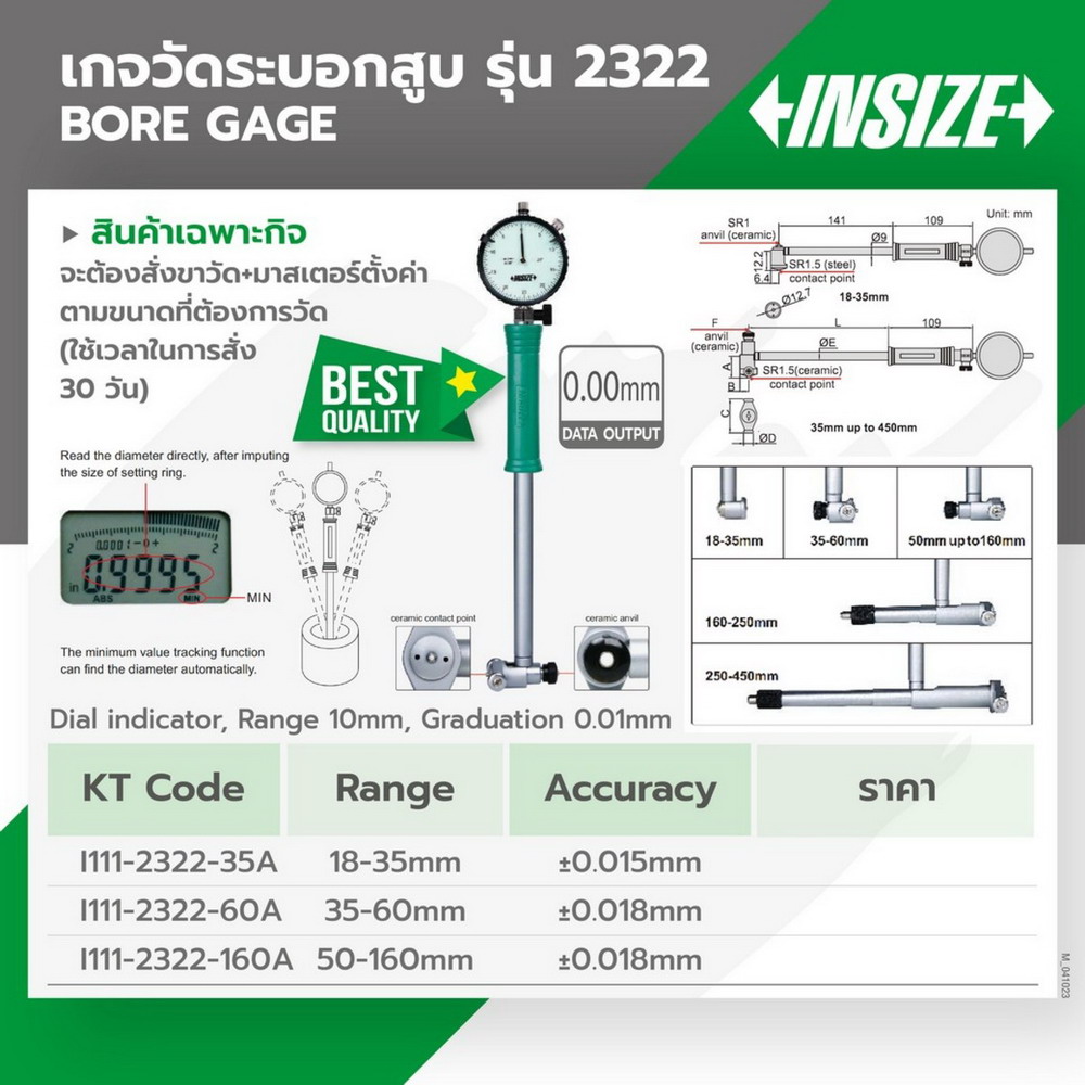 • เกจวัดกระบอกสูบ (บอร์เกจวัดรูใน) Bore Gage อินไซส์ (INSIZE) รุ่น 2322-60A ช่วงระยะวัด 35-60 มม. ความละเอียด 0.003 มม. ความแม่นยำ +/- 0.018 มม. สามารถเปลี่ยนไดอัลเกจเป็นดิจิตอลได้ (ไม่รวมแหวน)