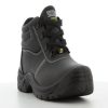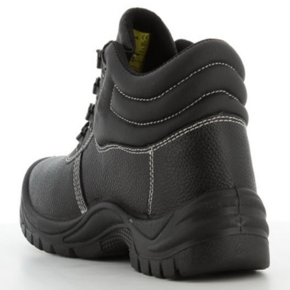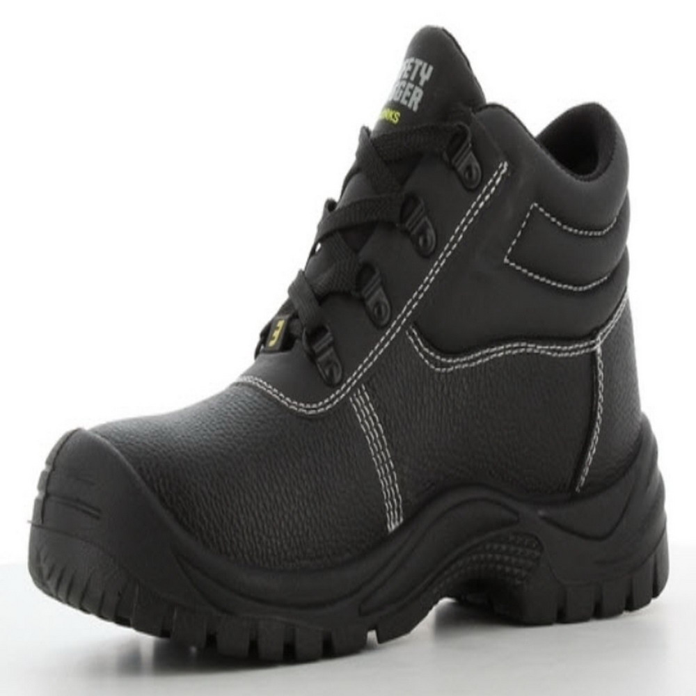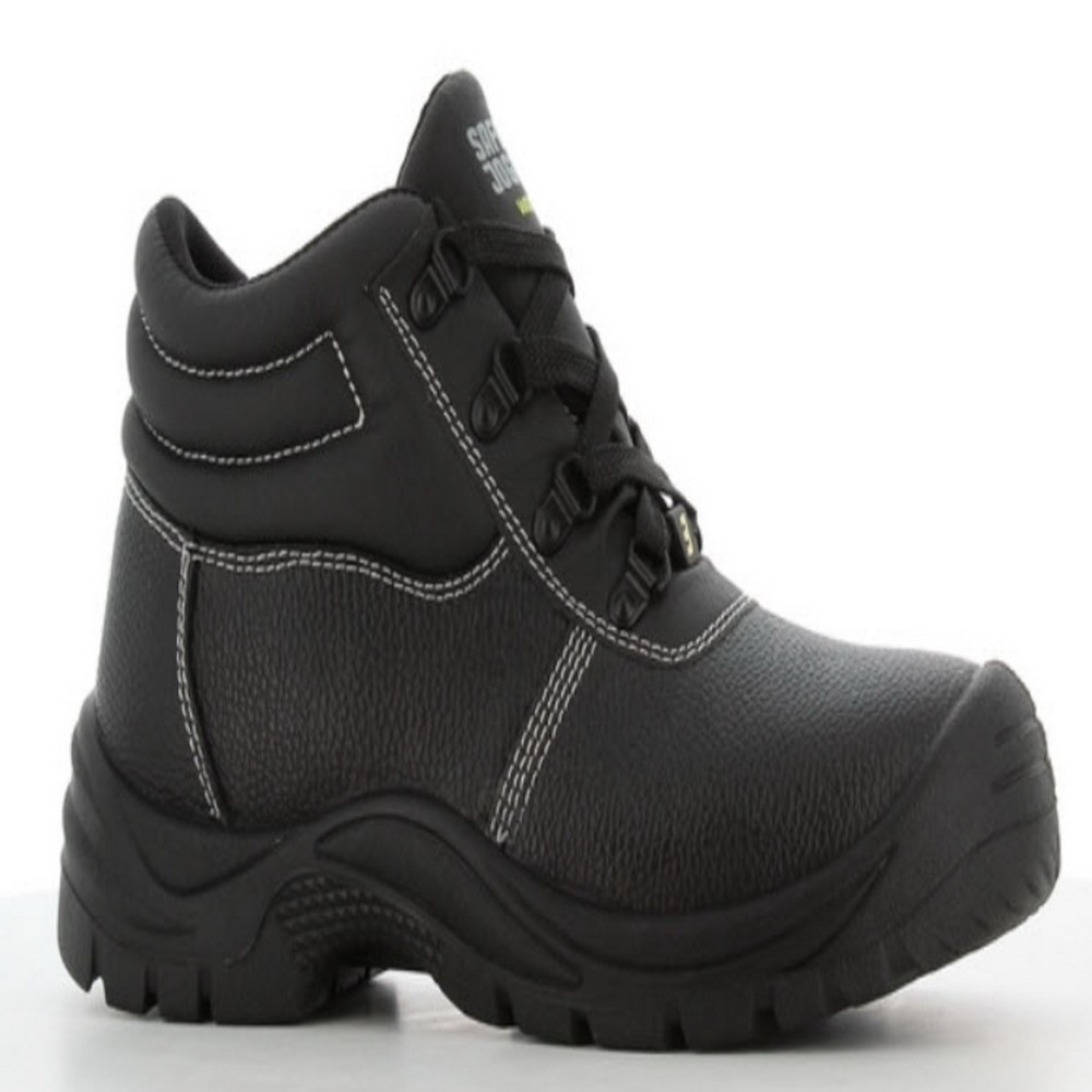 • รองเท้าหนังหุ้มข้อ สีดำ พื้นรองเท้ากันลื่น กันน้ำ ทนต่อน้ำมันและสารเคมี ป้องกันไฟฟ้าสถิตย์, หัวเหล็กกว้างพิเศษ,แผ่นเหล็กเสริมพื้นรองเท้าป้องกันสิ่งมีคมทะลุถึงเท้า