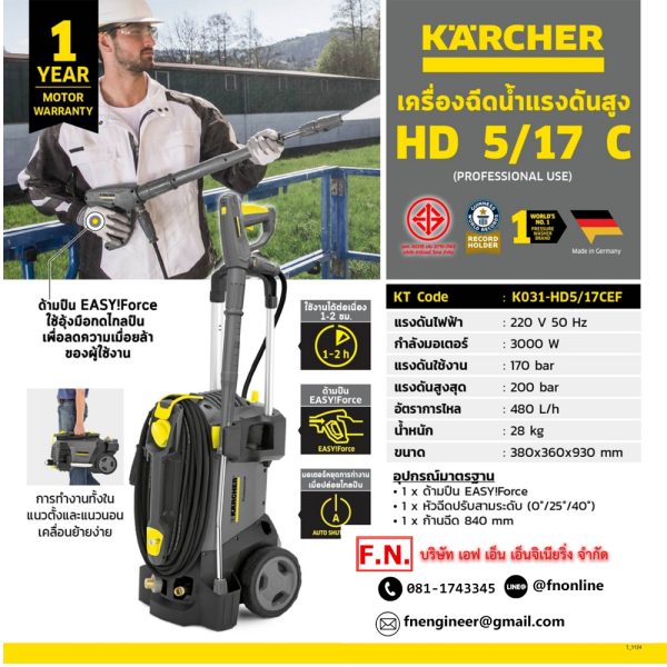 KARCHER HD 5/17 C เครื่องฉีดน้ำแรงดันสูงน้ำเย็น 3KW/230V. 170 บาร์