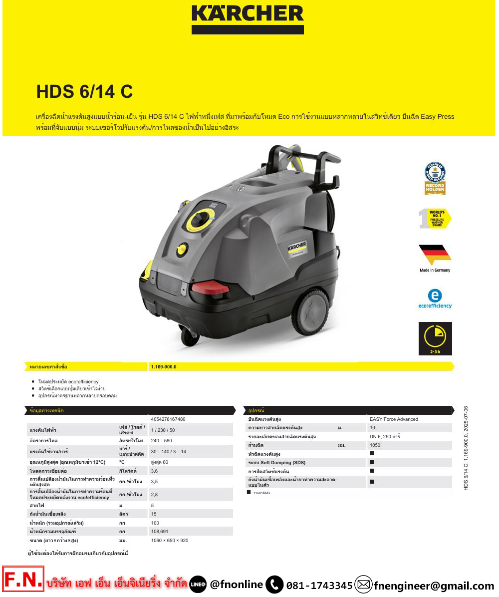 KARCHER HDS 6/14C เครื่องฉีดน้ำแรงดันสูงน้ำร้อน 3.6KW 230V. 1 เฟส แรงดันสูงสุด 140 บาร์