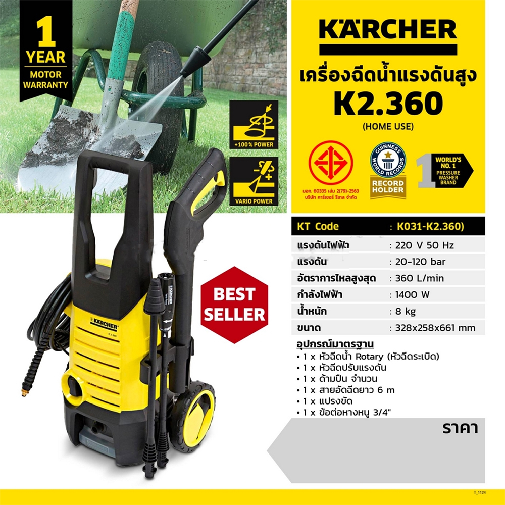 K2.360 เครื่องฉีดน้ำแรงดันสูง KARCHER ปรับแรงดันได้ 20 – 120 บาร์ อัตราการไหล 360 ลิตร/นาที กำลังมอเตอร์ 1,400 วัตต์