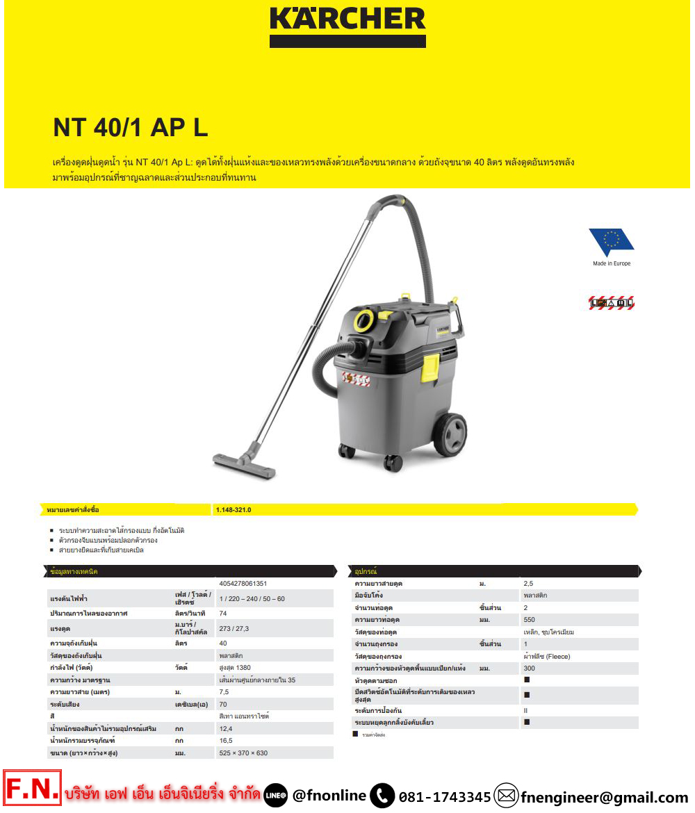 KARCHER NT40/1ApL เครื่องดูดฝุ่นน้ำ-แห้ง ถัง 40 ลิตร 1380W. 220V. ระบบกึ่งอัตโนมัติ