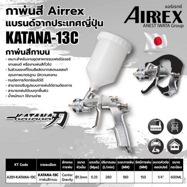 กาพ่นสี แบบกาบน ขนาด 600 มล. แอร์เร็กซ์ (AIRREX) รุ่น KATANA-13C หัวฉีดพ่นขนาด 1.3 มม. แรงดันลมใช้งาน 1-1.5 บาร์ เหมาะสำหรับงานอุตสาหกรรมเฟอร์นิเจอร์ ยานยนต์ หรืองานพ่นสีทั่วไป