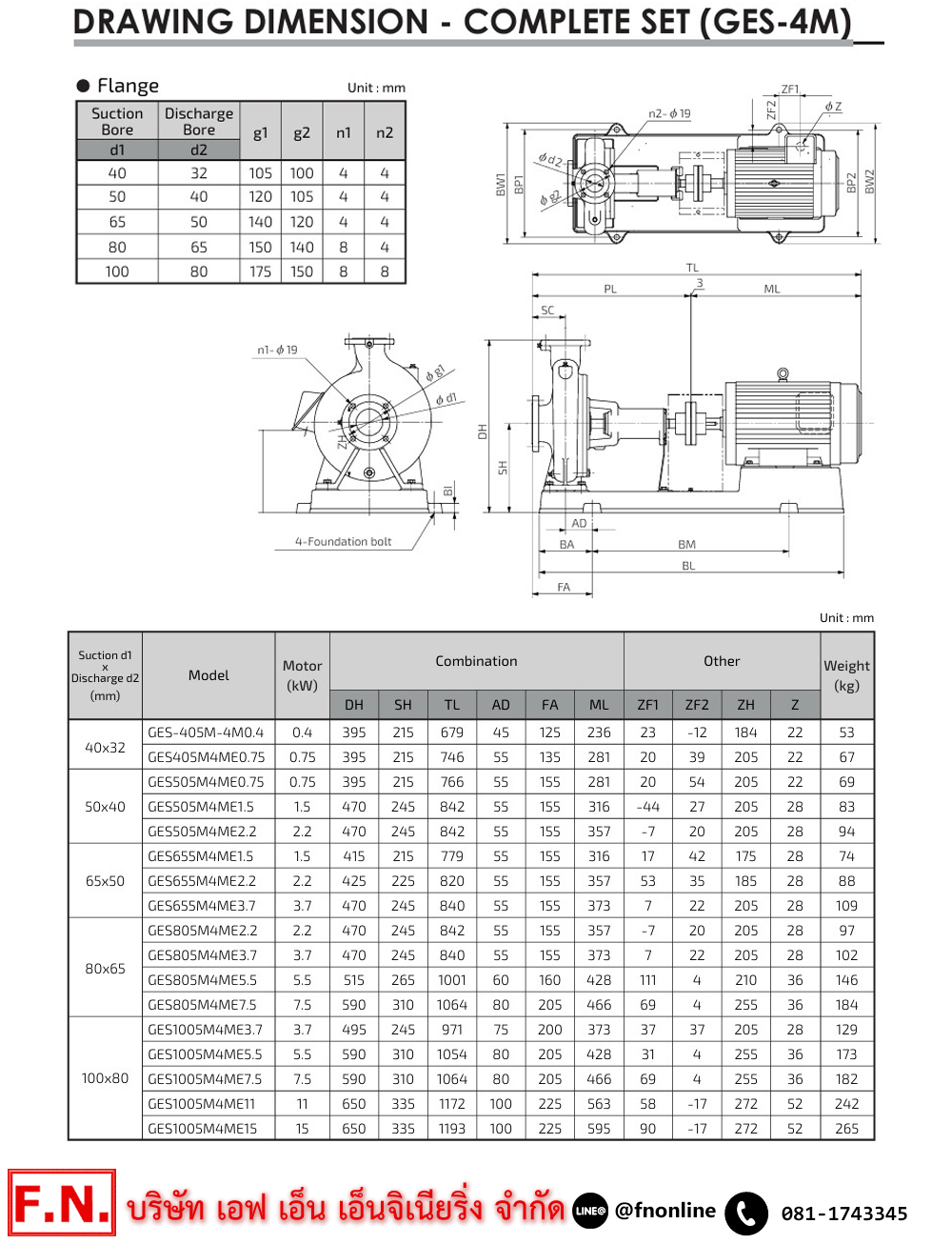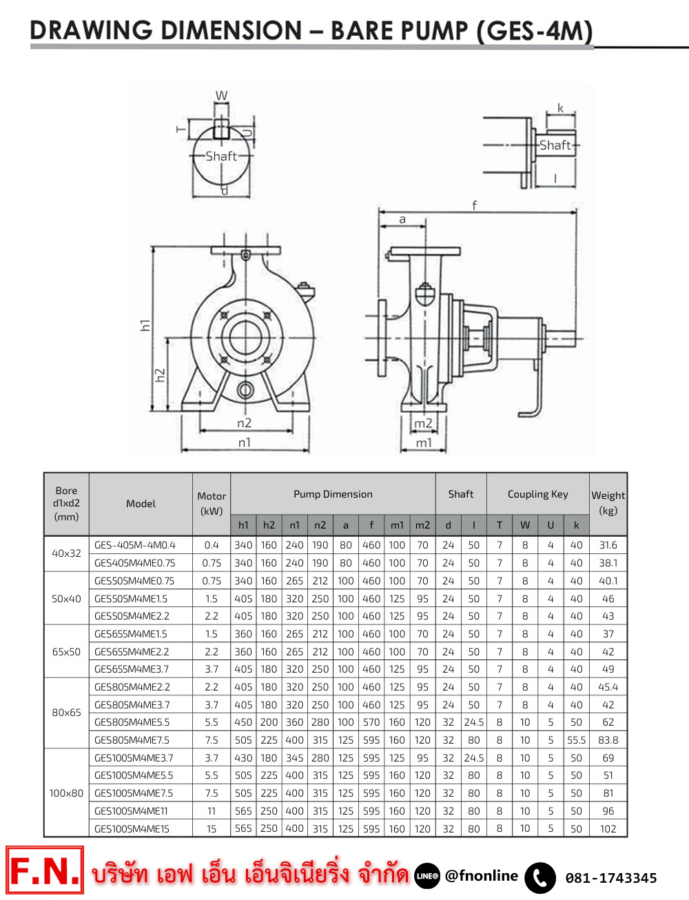 • KAWAMOTO GES805M4ME5.5 ปั๊มน้ำเพลาลอยสแตนเลส 7.5HP 1500RPM ท่อดูดส่ง 80 X 65 MM. (ไม่รวมแท่นและมอเตอร์)