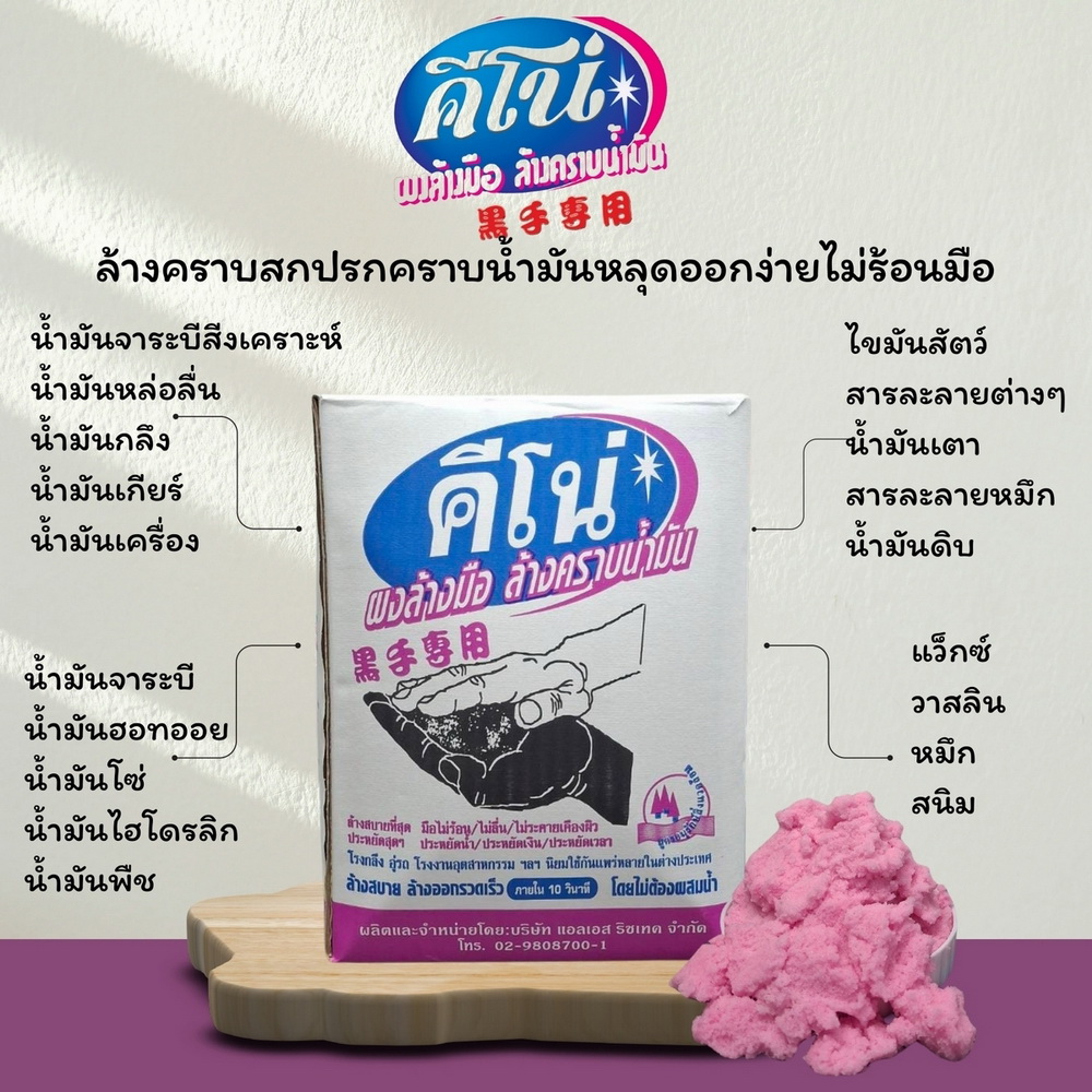 1.วิธีการล้างมือ ใช้ผงคีโน่ใส่บนฝ่ามือโดยไม่ต้องผสมน้ำ ขัดถูให้ทั่วแล้วใช้น้ำล้างออกอีกครั้ง มือไม่ลื่น ไม่มีสารระคายเคือง ไม่เปลืองน้ำ