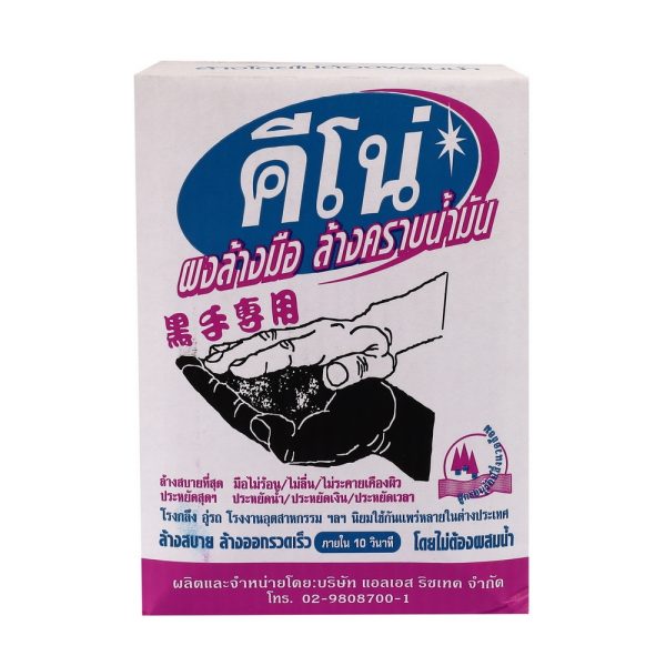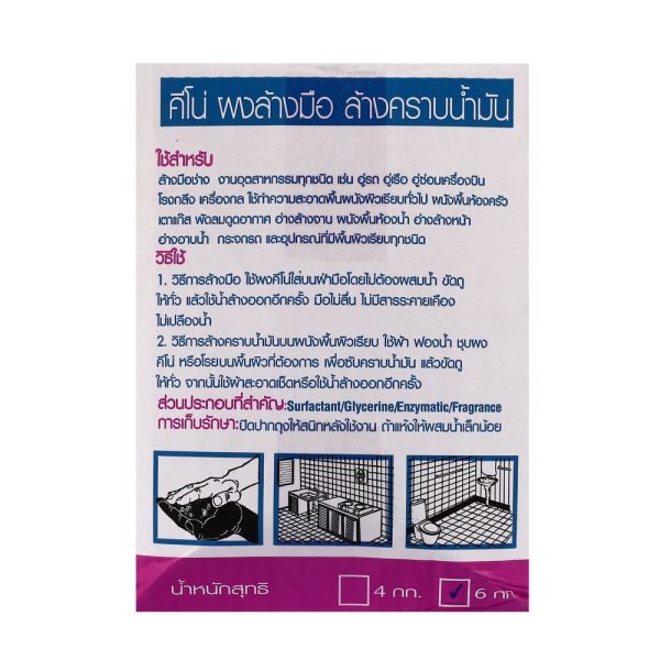 1.วิธีการล้างมือ ใช้ผงคีโน่ใส่บนฝ่ามือโดยไม่ต้องผสมน้ำ ขัดถูให้ทั่วแล้วใช้น้ำล้างออกอีกครั้ง มือไม่ลื่น ไม่มีสารระคายเคือง ไม่เปลืองน้ำ