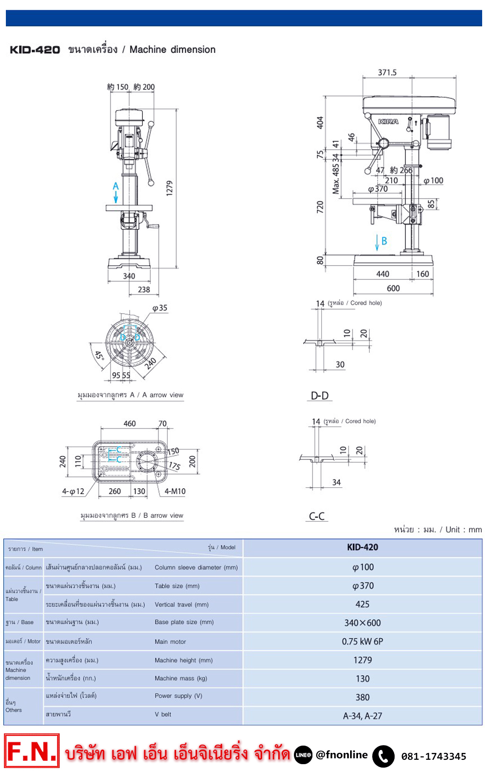 • KIRA KID-420 สว่านแท่น 750W. 6P 380V สามารถเจาะ 4-23 มิล ให้แรงเจาะที่ทรงพลัง