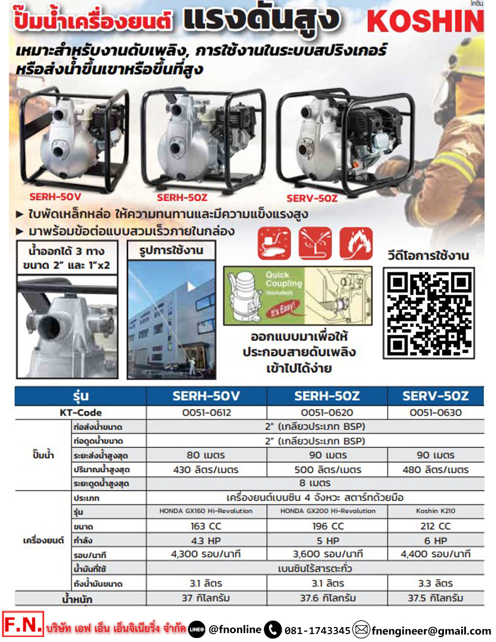 ORIENTAL KOSHIN ปั๊มน้ำเครื่องยนต์แรงดันสูง เครื่องสูบน้ำ รุ่น SERH-50Z เหมาะสำหรับใช้กับงานดับเพลิงแบบเคลื่อนที่ และระบบสปริงเกอร์ ขนาดท่อส่งออกและดูดเข้า 2 นิ้ว ระยะส่งน้ำสูงสุด 90 เมตร เครื่องยนต์ Honda GX200 Hi-Revolution (สตาร์ทด้วยมือ)