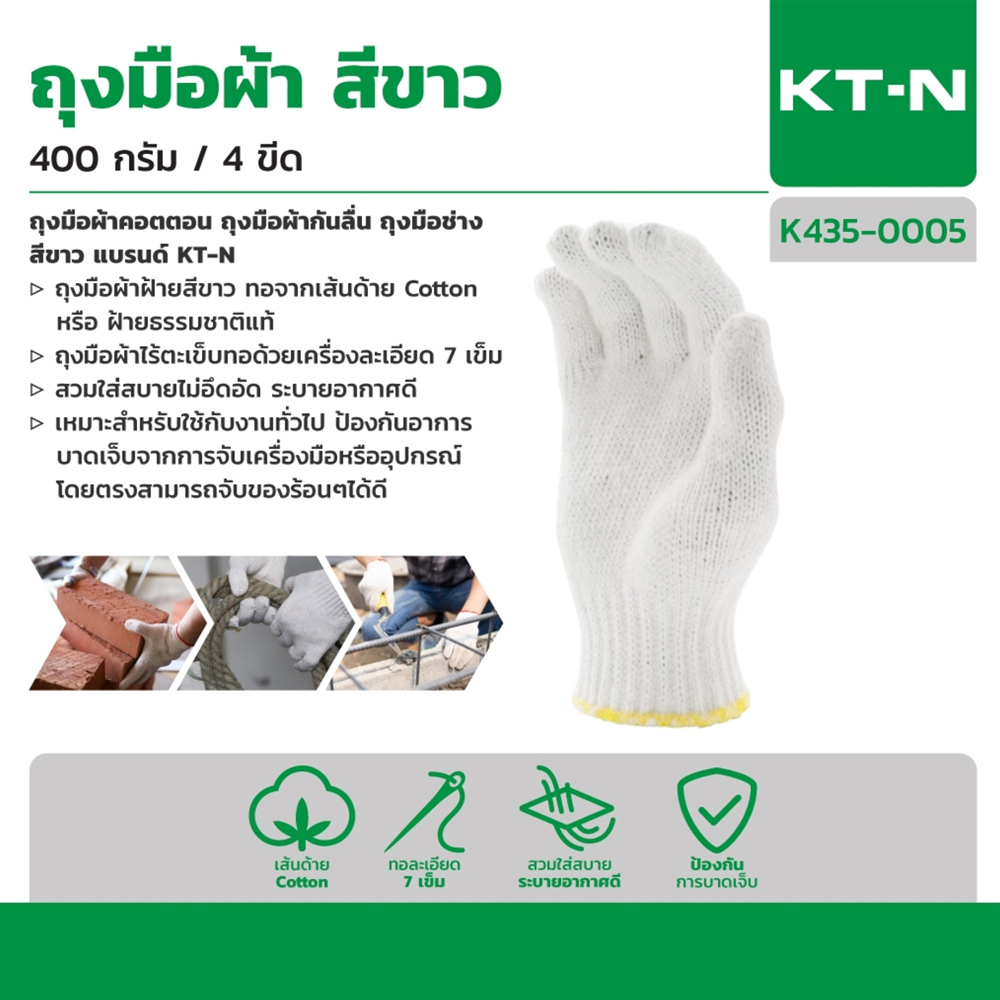 KT-N ถุงมือผ้า ถุงมือผ้าทอ ถุงมือผ้าฝ้าย สีขาว น้ำหนัก 400 กรัม / 4 ขีด เหมาะสำหรับใช้กับงานทั่วไป ป้องกันอาการบาดเจ็บ (บรรจุ : 1 โหล/12 คู่) (เคที-เอ็น)