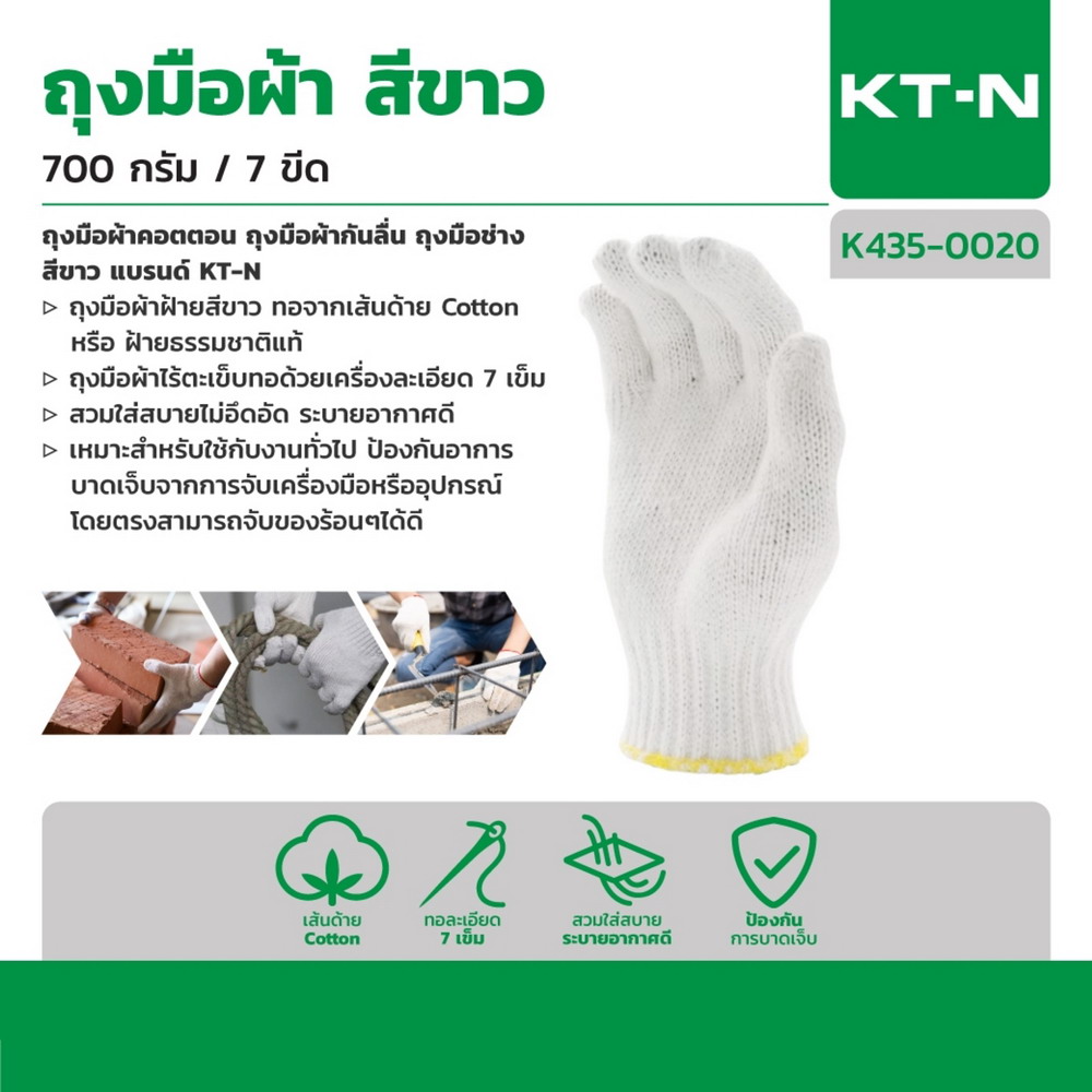 KT-N ถุงมือผ้า ถุงมือผ้าทอ ถุงมือผ้าฝ้าย สีขาว น้ำหนัก 700 กรัม / 7 ขีด เหมาะสำหรับใช้กับงานทั่วไป ป้องกันอาการบาดเจ็บ (บรรจุ : 1 โหล/12 คู่) (เคที-เอ็น)