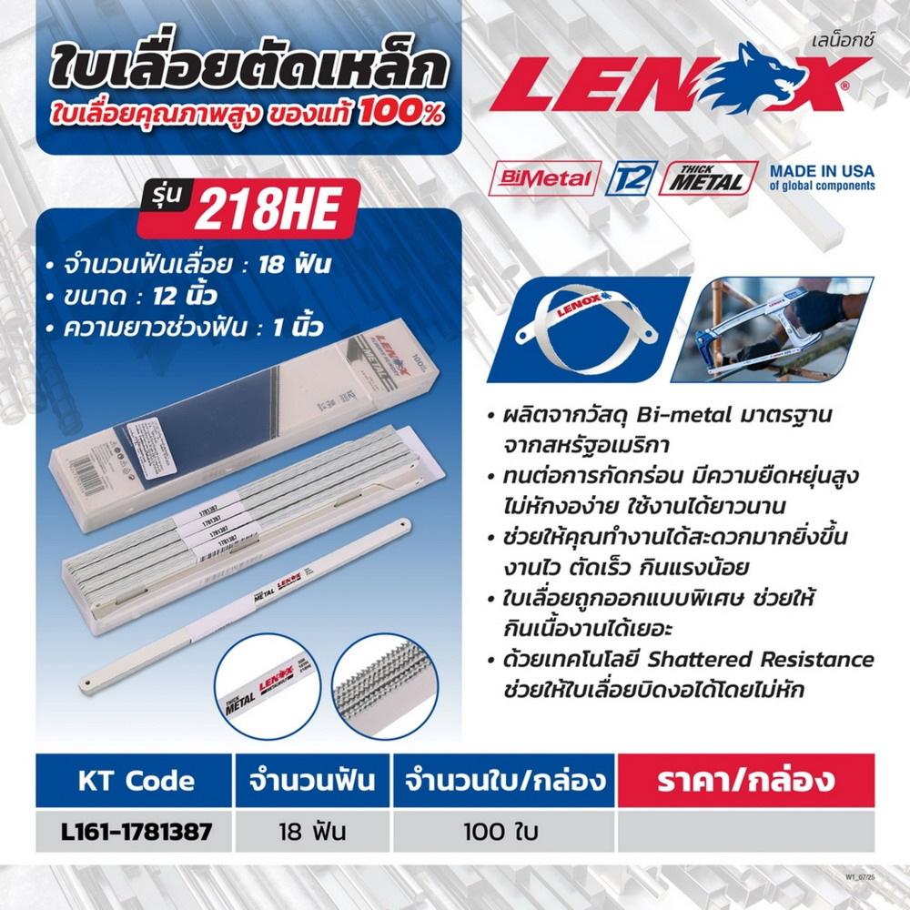 LENOX 218HE ใบเลื่อยตัดเหล็ก 12 นิ้ว 18 ฟัน ผลิตจากวัสดุ Bi-Metal 100ใบ/กล่อง
