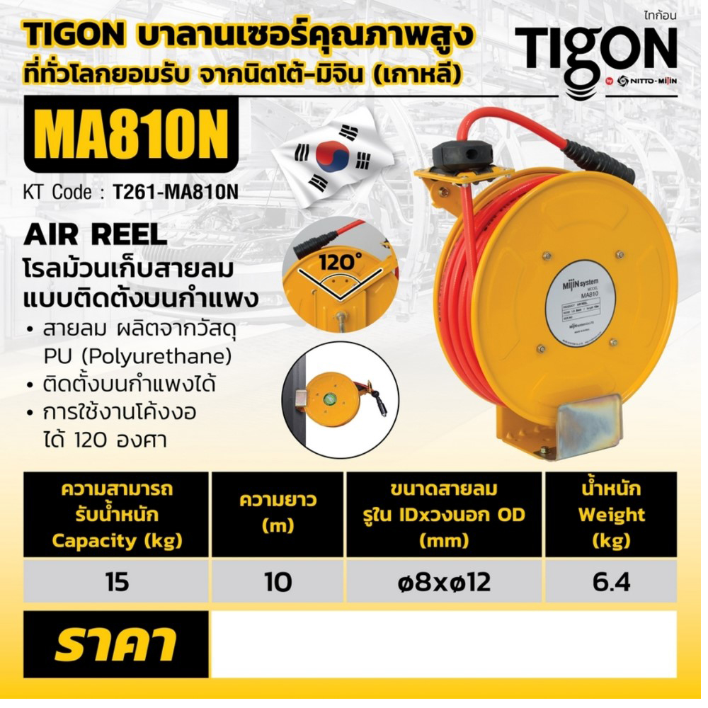 โรลม้วนเก็บสายลม ไทก้อน (Tigon) ขนาดรูด้านใน 8 มม. ขนาดรูด้านนอก 12 มม. ความยาว 10 เมตร แรงดันสูงสุดขณะทำงาน 15 บาร์ เหมาะกับใช้งานในอุตสาหกรรมทั่วไป ผลิตจากประเทศเกาหลี