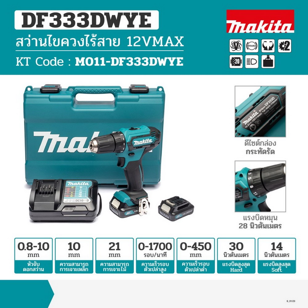 MAKITA สว่านไขควงไร้สาย 12V. ขนาด 3/8 นิ้ว รุ่น DF333DWYE แรงบิดหมุน 28 นิวตันเมตร รวมแบตและแท่นชาร์จ