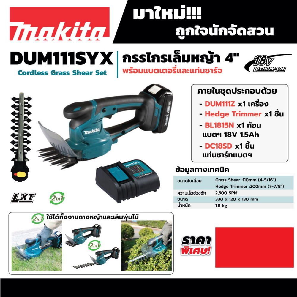 MAKITA กรรไกรเล็มหญ้าไร้สาย 18 โวลต์ ความกว้างในการตัดหญ้า 110 มม. รุ่น DUM111SYX ความกว้างในการตัดแต่งพุ่มไม้ 200 มม. 2IN1 รวมแบตเตอรี่-แท่นชาร์จ