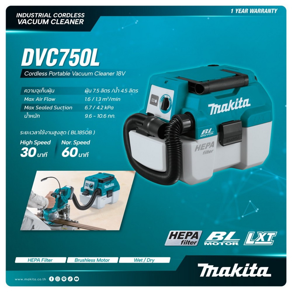 MAKITA เครื่องดูดฝุ่น-เป่าไร้สาย 18 โวลต์ ถังเก็บฝุ่น 7.5 ลิตร รุ่น DVC750LZ ถังเก็บน้ำ 4.5 ลิตร มอเตอร์ไร้แปรงถ่าน ไม่รวมแบตเตอรี่-แท่นชาร์จ