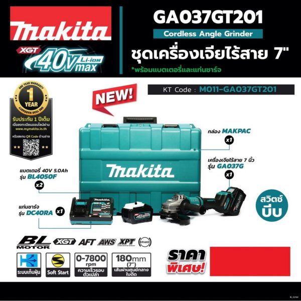 • เครื่องเจียไร้สาย 40 โวลต์ MAKITA รุ่น GA037GT201 ขนาด 7 นิ้ว (รวมแบตเตอรี่และแท่นชาร์จ)
