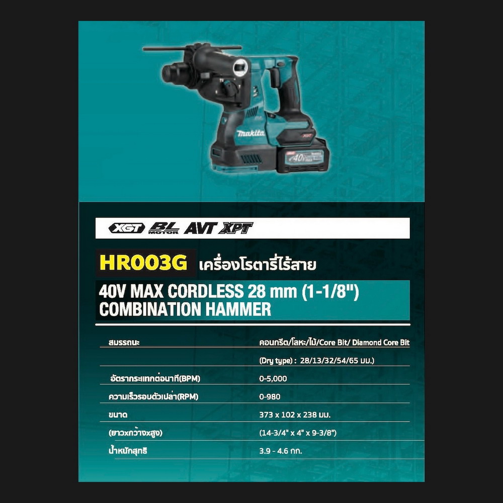MAKITA สว่านโรตารี่ไร้สาย 40 โวลต์ ขนาด 28 มม. (1-1/8 นิ้ว) รุ่น HR003GZ ขนาดหัวจับดอกสว่าน 1/2 นิ้ว ใช้กับดอกสว่าน SDS PLUS ไม่รวมแบตเตอรี่-แท่นชาร์จ