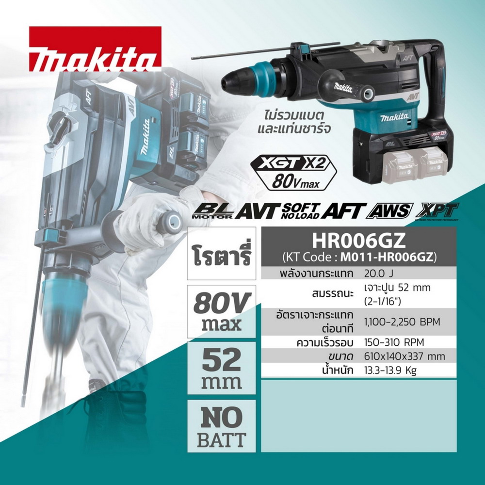• สว่านโรตารี่ไร้สาย 80 โวลต์ MAKITA รุ่น HR006GZ ขนาด 52 มม. (ไม่รวมแบตเตอรี่และแท่นชาร์จ)