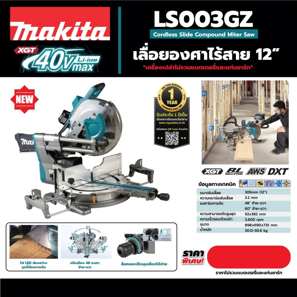MAKITA LS003GZ แท่นตัดไลด์องศา 40V. ขนาด 12″+ใบเลื่อยวงเดือน TCT 12″x60T (ไม่รวมแบตเตอรี่และแท่นชาร์จ)