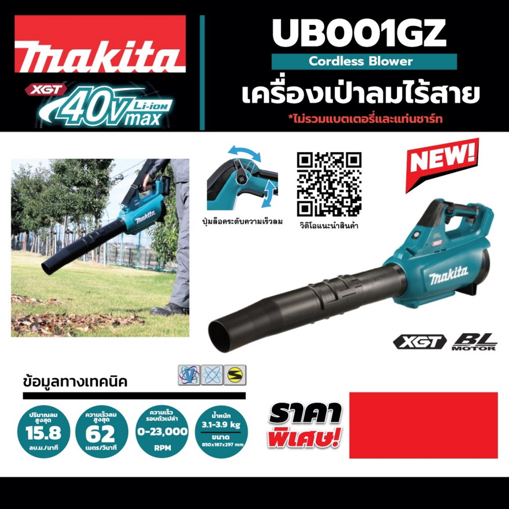MAKITA เครื่องเป่าลมไร้สาย 40V. รุ่น UB001GZ มอแตอร์ไร้แปรงถ่าน (BL Motor) ไม่รวมแบตเตอรี่-แท่นชาร์จ