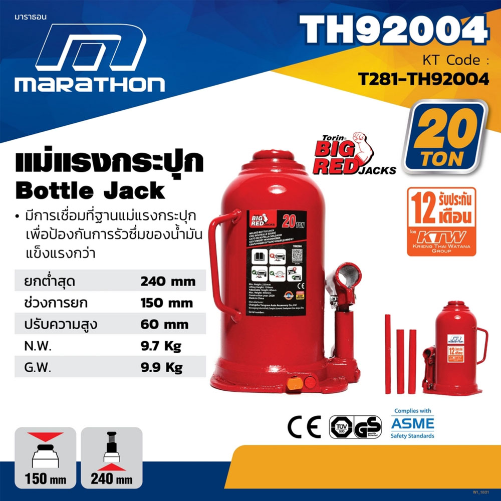MARATHON แม่แรงกระปุก 20 ตัน รุ่น TH92004 ความสูงเมื่อยกสูงสุด 445 มม. ช่วงการยก 150 มม. ปรับความสูง 60 มม.