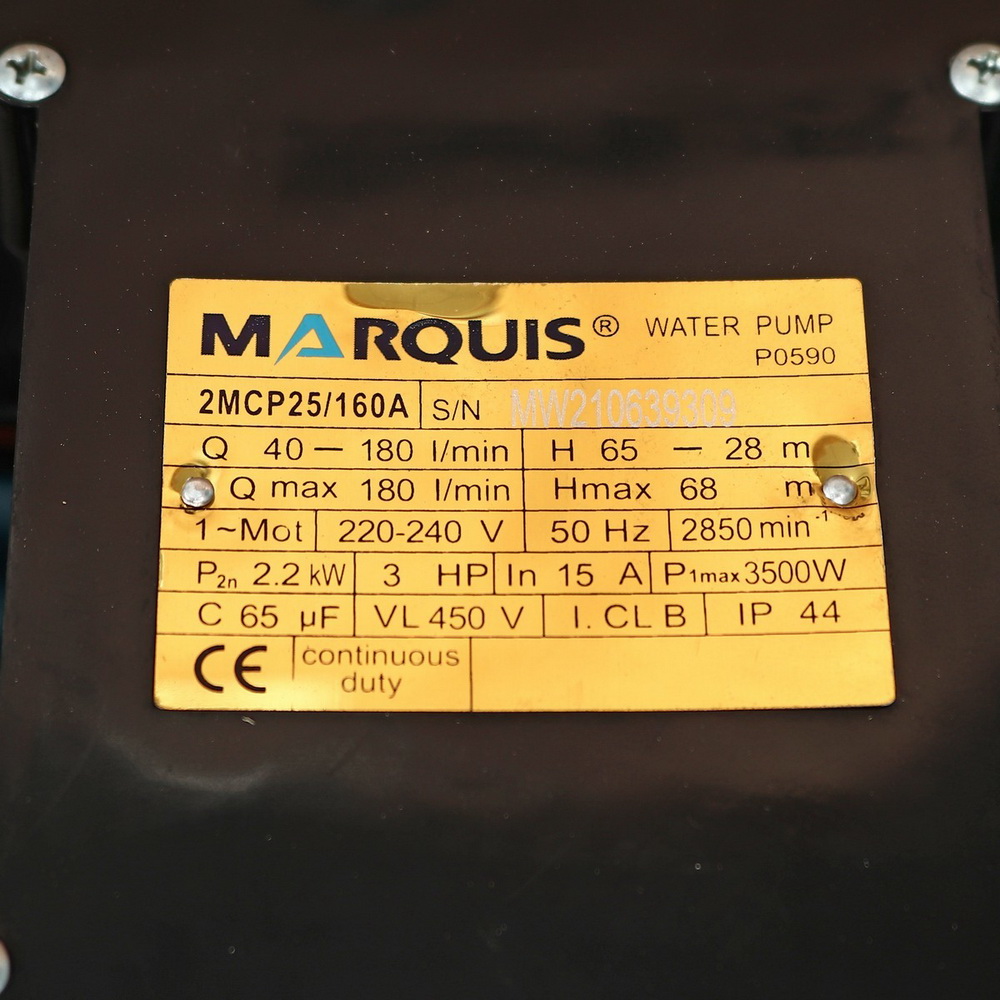 MARQUIS 2MCP25/160B ปั๊มหอยโข่ง 2 ใบพัด 2HP. 220V. ท่อดูด 1.1/4″ ท่อส่ง 1″ ปริมาณน้ำ 160 L/min ส่งสูง 58M.