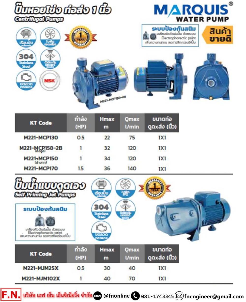• MARQUIS MCP170 ปั๊มหอยโข่งท่อส่ง 1.5HP. 220V. ท่อส่ง 1″ ปริมาณน้ำ 140 L/min ส่งสูง 36M