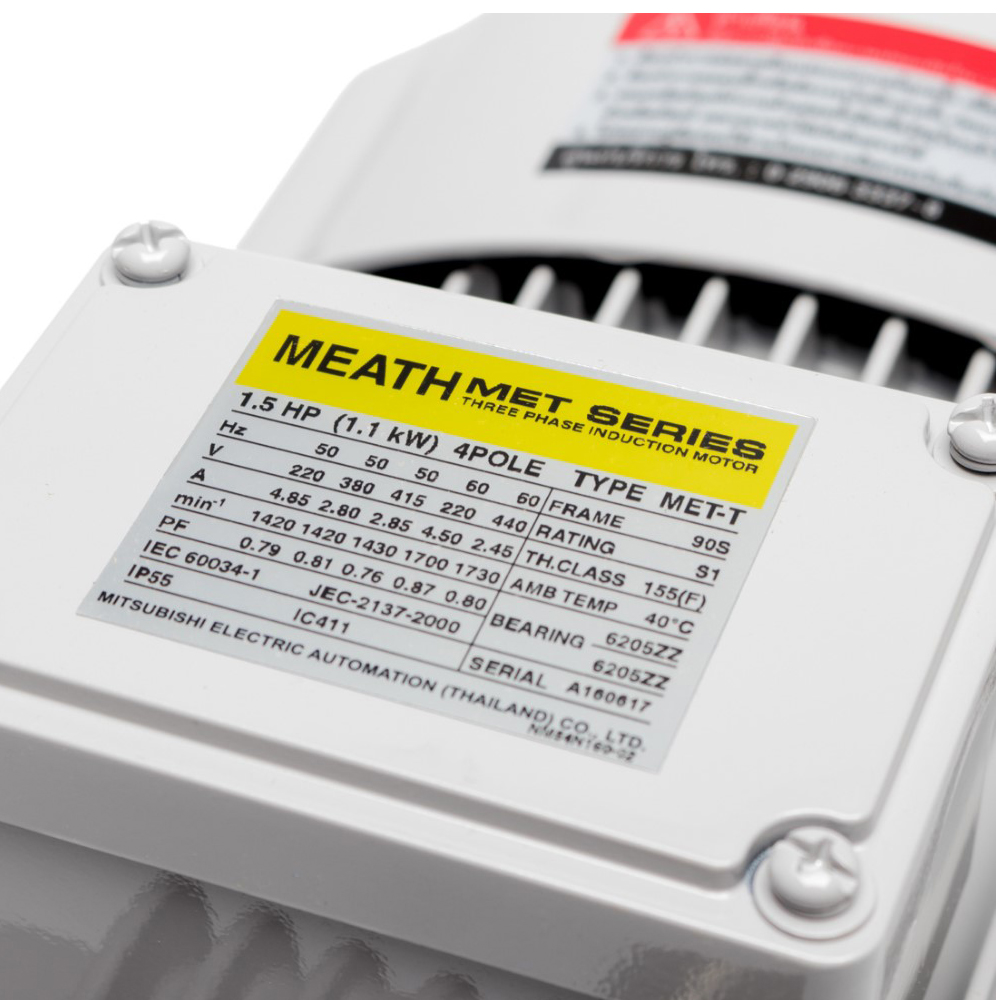 มอเตอร์ไฟฟ้า MITSUBISHI รุ่น MET-T กำลัง 1.5 แรงม้า (1.1 กิโลวัตต์) 3 เฟส 220/380 โวลต์ 4 โพล 3 สาย IP55 ความเร็วรอบ 1450 RPM (รอบต่อนาที)