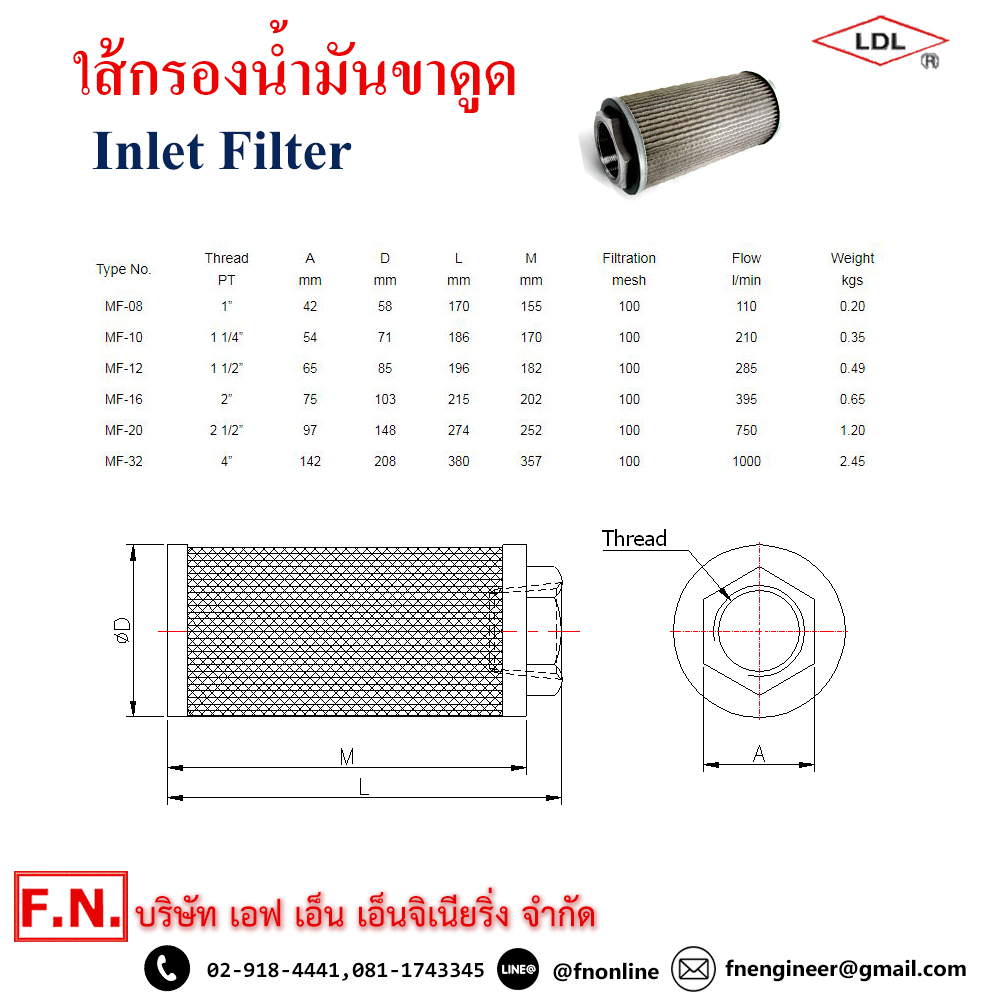MF-20 ใส้กรองน้ำมันขาดูด 2.1/2″ อัตราการไหล 750 ลิตร/นาที