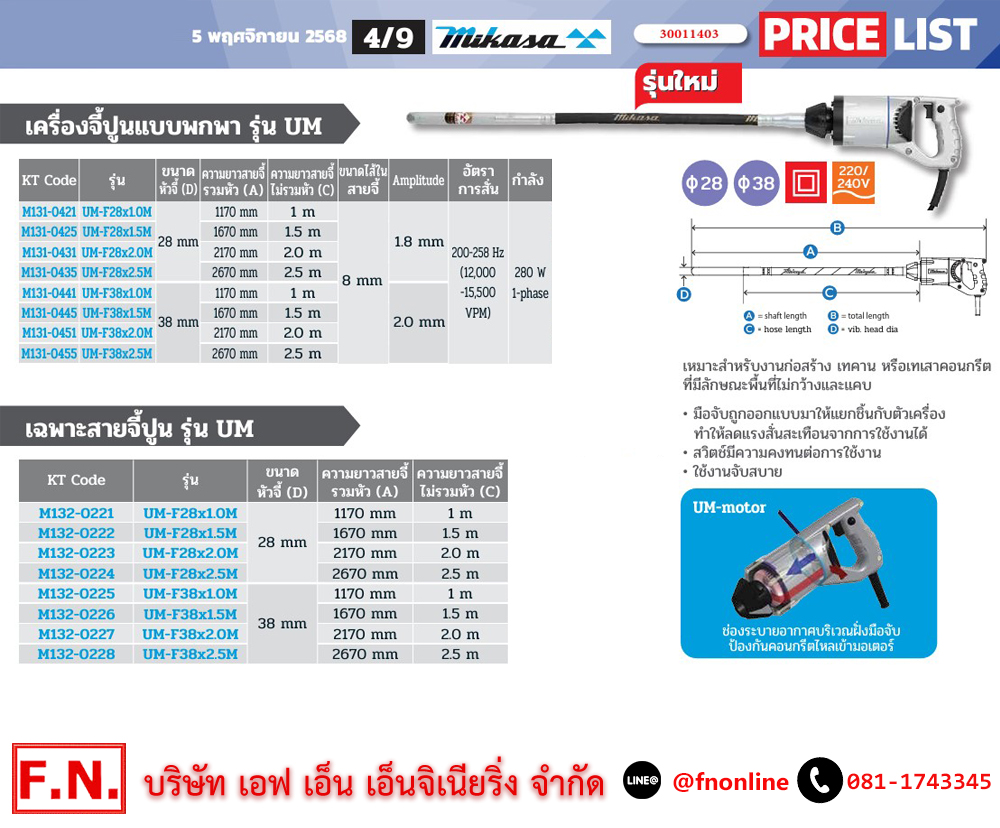 • ใช้กับเครื่องจี้ปูน แบบมือถือ MIKASA รุ่น UM-28×1.0M, UM-28×1.5M,