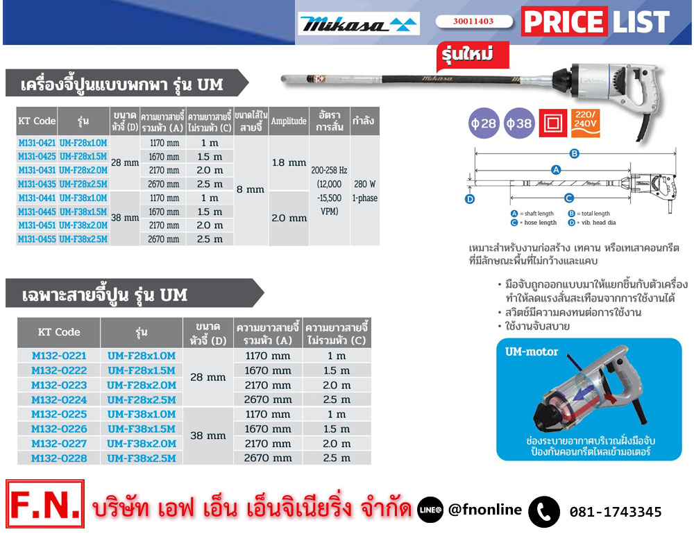 • ใช้กับเครื่องจี้ปูน แบบมือถือ MIKASA รุ่น UM-28×1.0M, UM-28×1.5M,UM-28×2.0M, UM-28×2.5M, UM-38×1.0M, UM-38×1.5M, UM-38×2.0M และ UM-38×2.5M