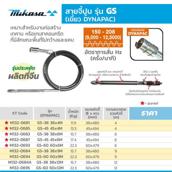 • สายจี้ Dynapac (รุ่นประหยัด) MIKASA รุ่น GS-70 ขนาดหัวจี้ 70 มม. ความยาว 479 มม. ความยาวสายรวมหัวจี้ 4 เมตร