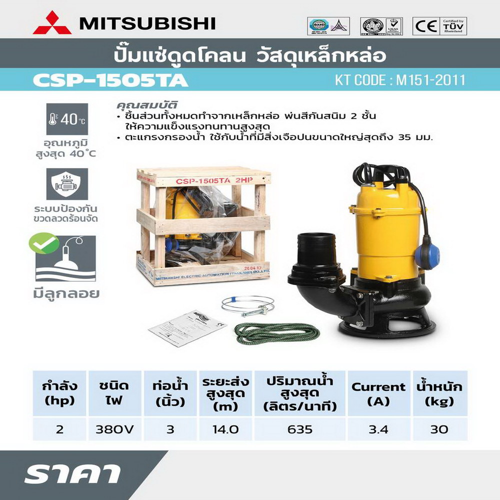 MITSUBISHI CSP-1505TA ปั๊มแช่ดูดโคลนแบบมีลูกลอย 2HP 380V 3เฟส ท่อ 3 นิ้ว