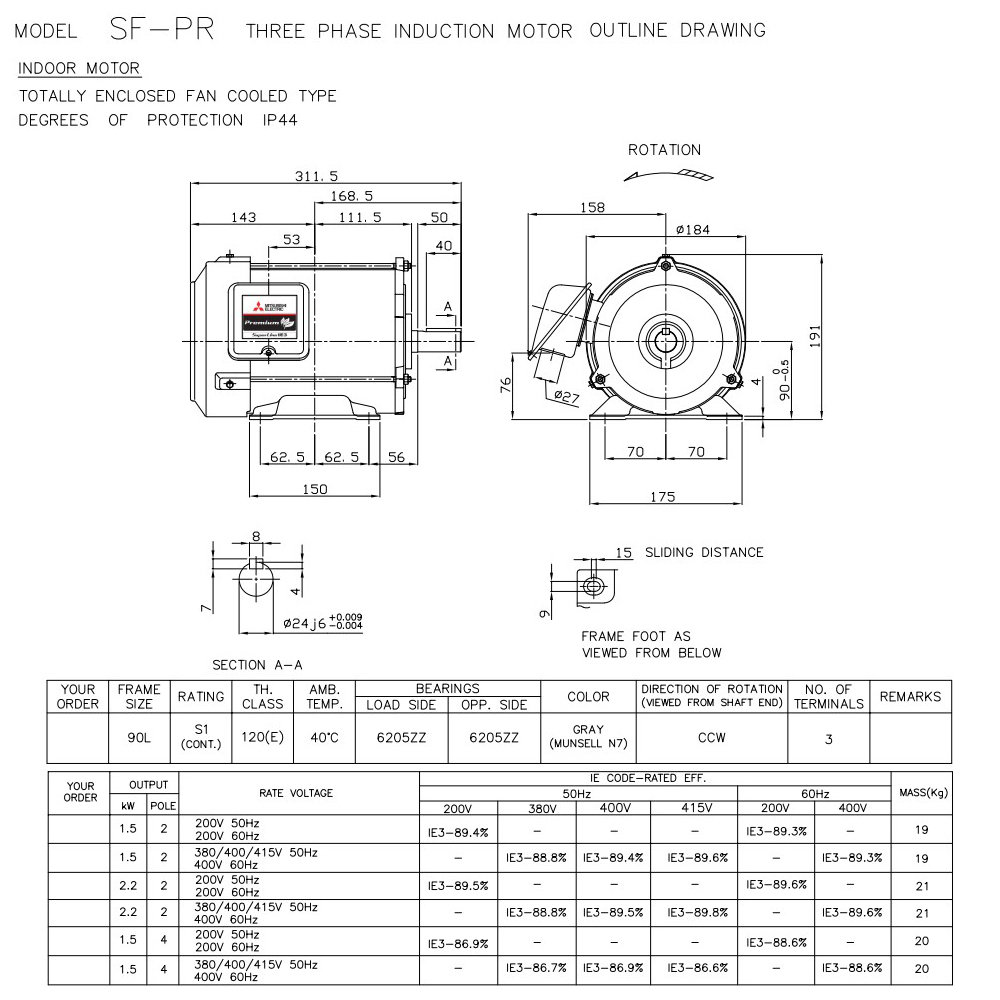 MITSUBISHI SF-PR 1.5kW 4P มอเตอร์ขาตั้ง 2HP 3 เฟส 380V 4Pole IP44 มาตรฐาน IE3