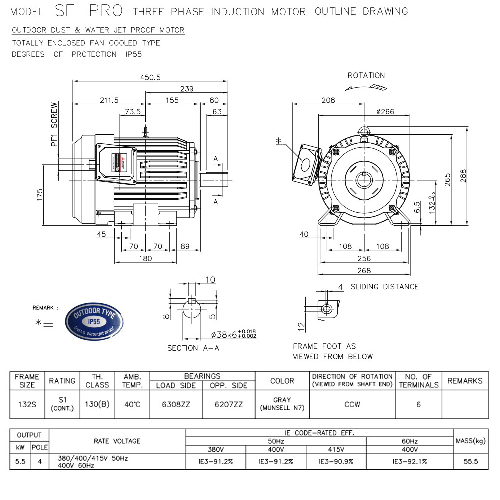 • MITSUBISHI SF-PRO 5.5kW 4P IP55 มอเตอร์ขาตั้ง 7.5HP 3 เฟส 380V 4Pole มาตรฐาน IE3