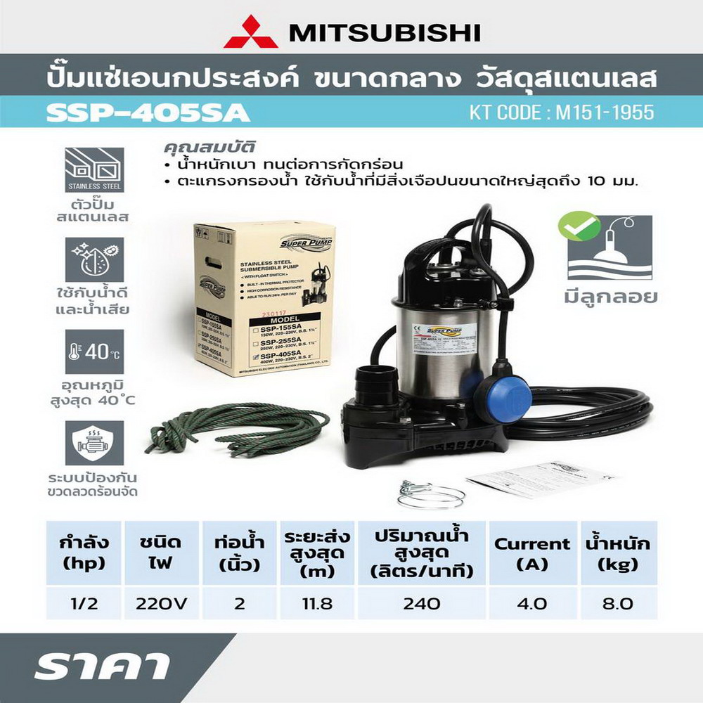 MITSUBISHI SSP-405SA(.15) ปั๊มแช่แสตนเลส แบบมีลูกลอย 1/2HP 220V ท่อส่ง 2 นิ้ว