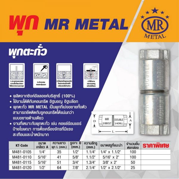 • พุกตะกั่ว แบรนด์ MR METAL (เอ็มอาร์ เมทัล) รุ่น PK-DB1/4 ขนาด 1/4 นิ้ว