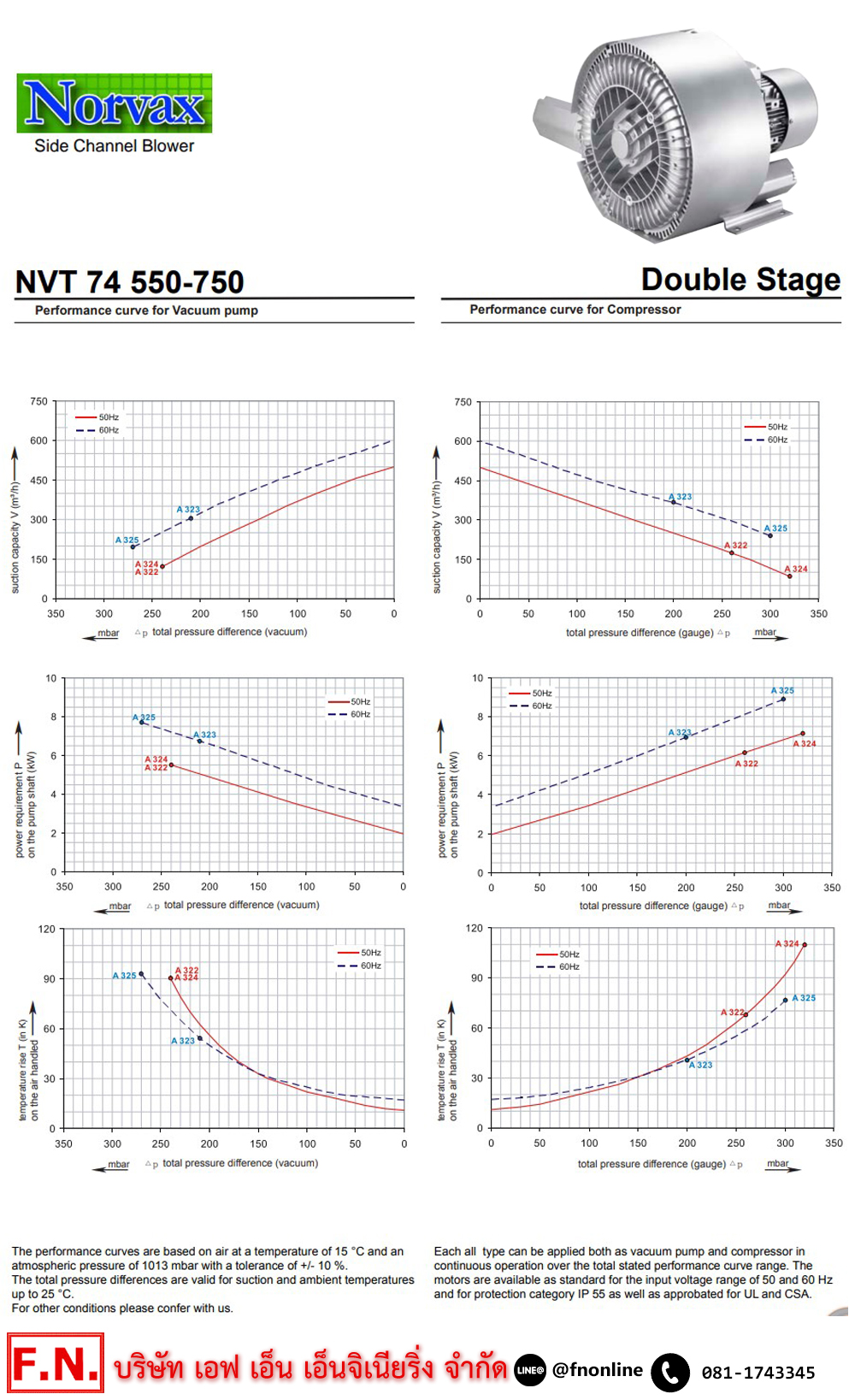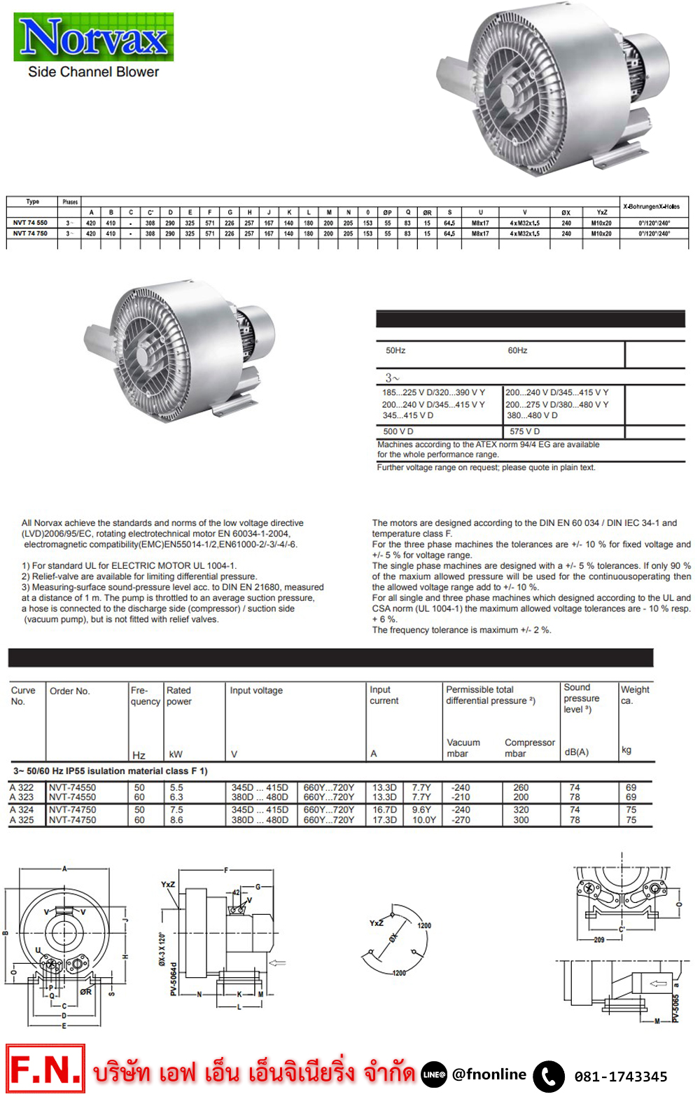 • NORVAX NVT-74750 ริงโบล์เวอร์ พัดลมแรงดันสูง 2 ใบพัด 7.5KW 415V ท่อ 55 มิล