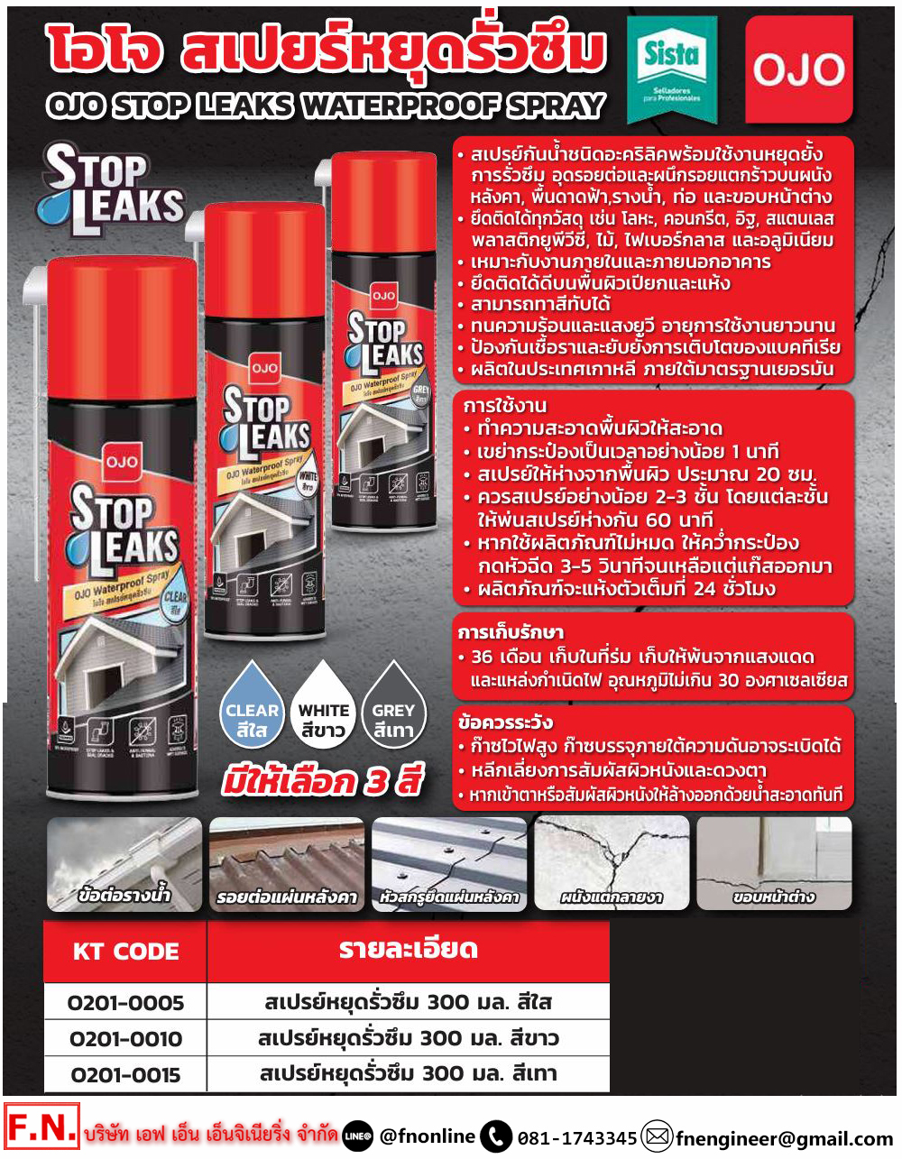 • สเปรย์กันน้ำชนิดอะคริลิคพร้อมใช้งานหยุดยั้งการรั่วซึมอุดรอยต่อและผนึกรอยแตกร้าว บนผนัง, หลังคา, พื้น